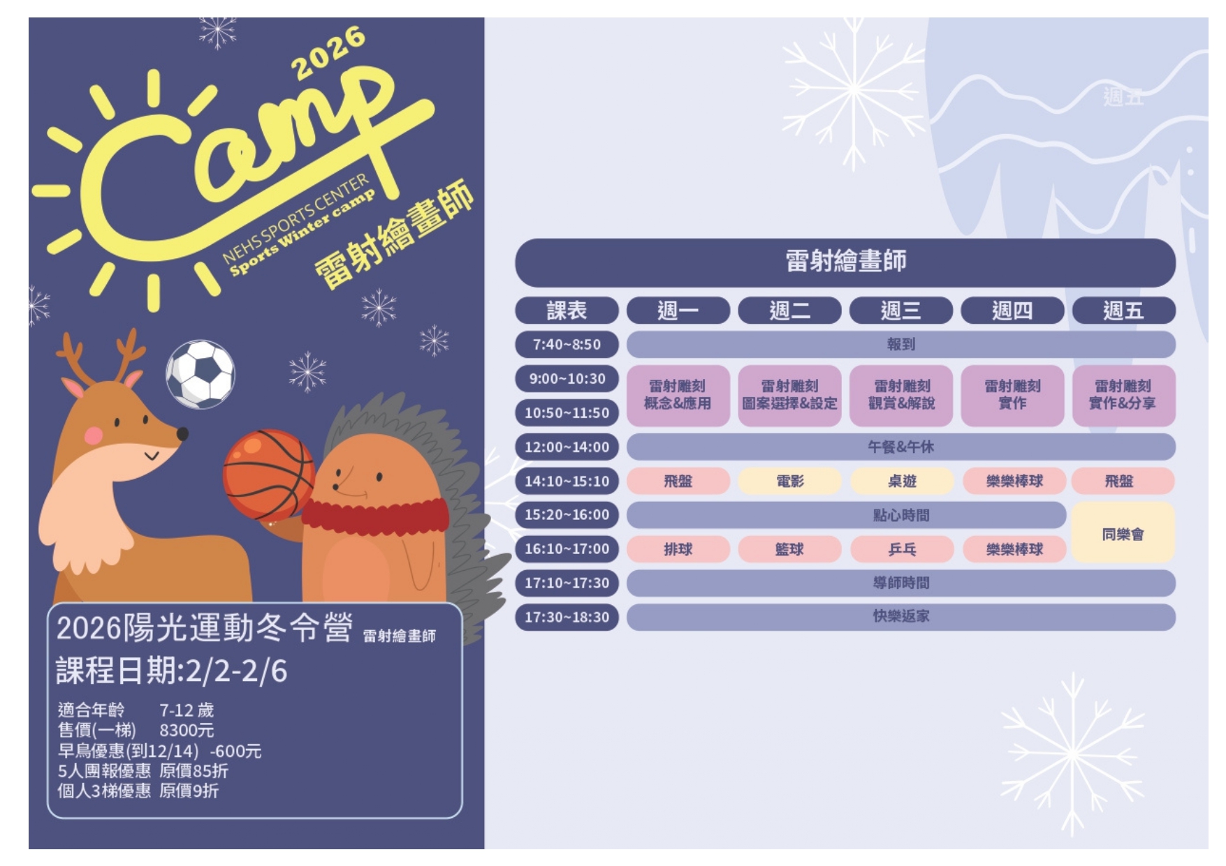 home 首頁 navigate_next 線上報名 navigate_next 2026 陽光冬令營 navigate_next 綜合運動全日營 navigate_next 雷射繪畫師
