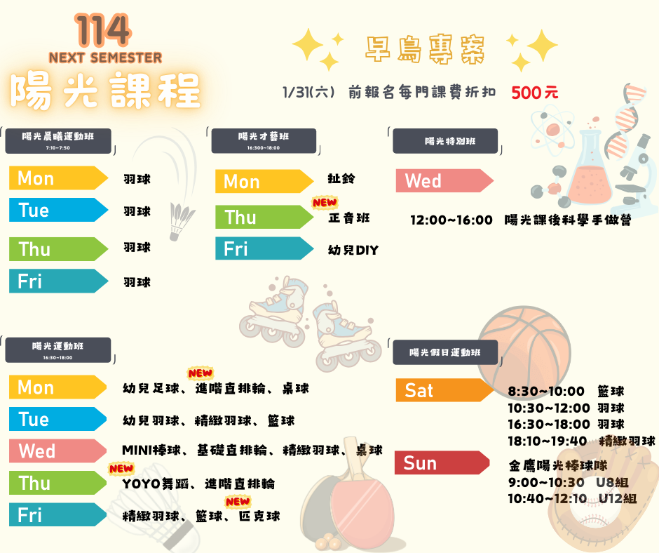 home 首頁 navigate_next 線上報名 navigate_next 114學年度下學期課程 navigate_next 假日運動課程 navigate_next 週日 金鷹陽光棒球隊U12組